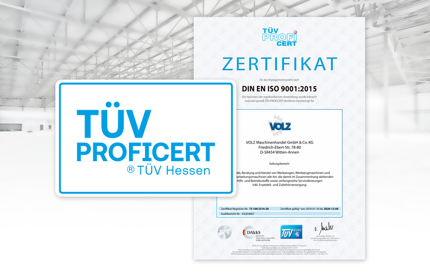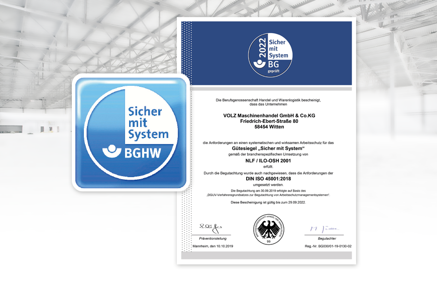 Als erster Werkzeugmaschinenlieferant und Systempartner für Industrie und Handwerk in Deutschland ist VOLZ durch die BG Handel- und Warenlogistik (BGHW) nach DIN ISO 45001:2018 und NLF / ILO-OSH 2001 – „Sicher mit System“ zertifiziert.